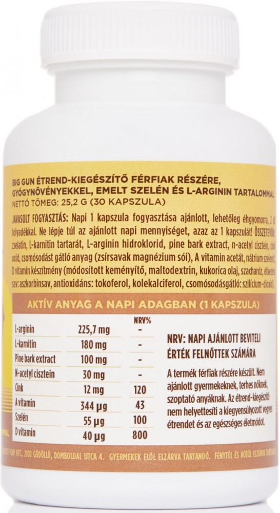 BIG GUN: a prémium sperma növelő készítmény, mely egy növényi kivonatokat tartalmazó étrend-kiegészítő kapszula férfiak részére. Szedésével erőteljesebb ejakuláció és kitűnő férfi nemzőképesség érhető el.