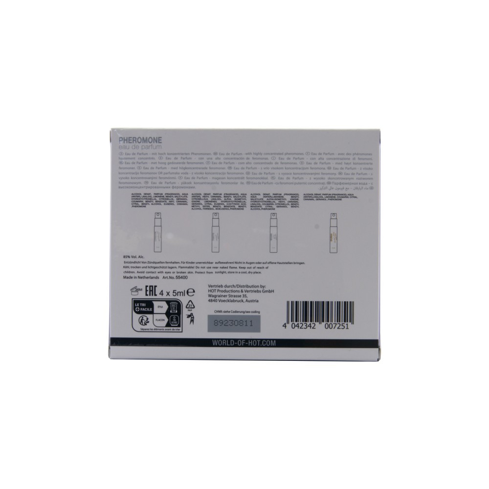 A csomag tartalma: 5 ml London, Dubai, Miami és Tokyo feromonos